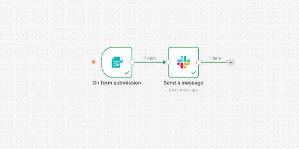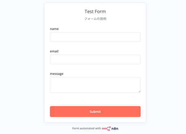 まずテストとして小さなものを作ってみようと、フォームに入力されたものをSlackに通知するというワークフローを作りました。一番上の図にあるように、そういうパーツを組み合わせていろんな処理を自動化するというツールです。GUIはないという情報も見たのですが間違いだったようで、フォームも簡単に作成できるので簡易的なものならこれだけで動かせそうです。