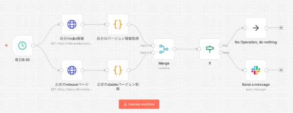 セキュリティの問題もありますし、今後もバージョンチェックはしようということでせっかくなのでn8n自身でバージョンチェックをするワークフローを作りました。