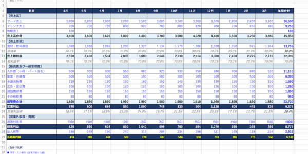 試しに「レストラン一店舗の事業計画を作りたい。PLのサンプルを作って。1年分。4月始まり」と入力すると一発で作ってくれました。